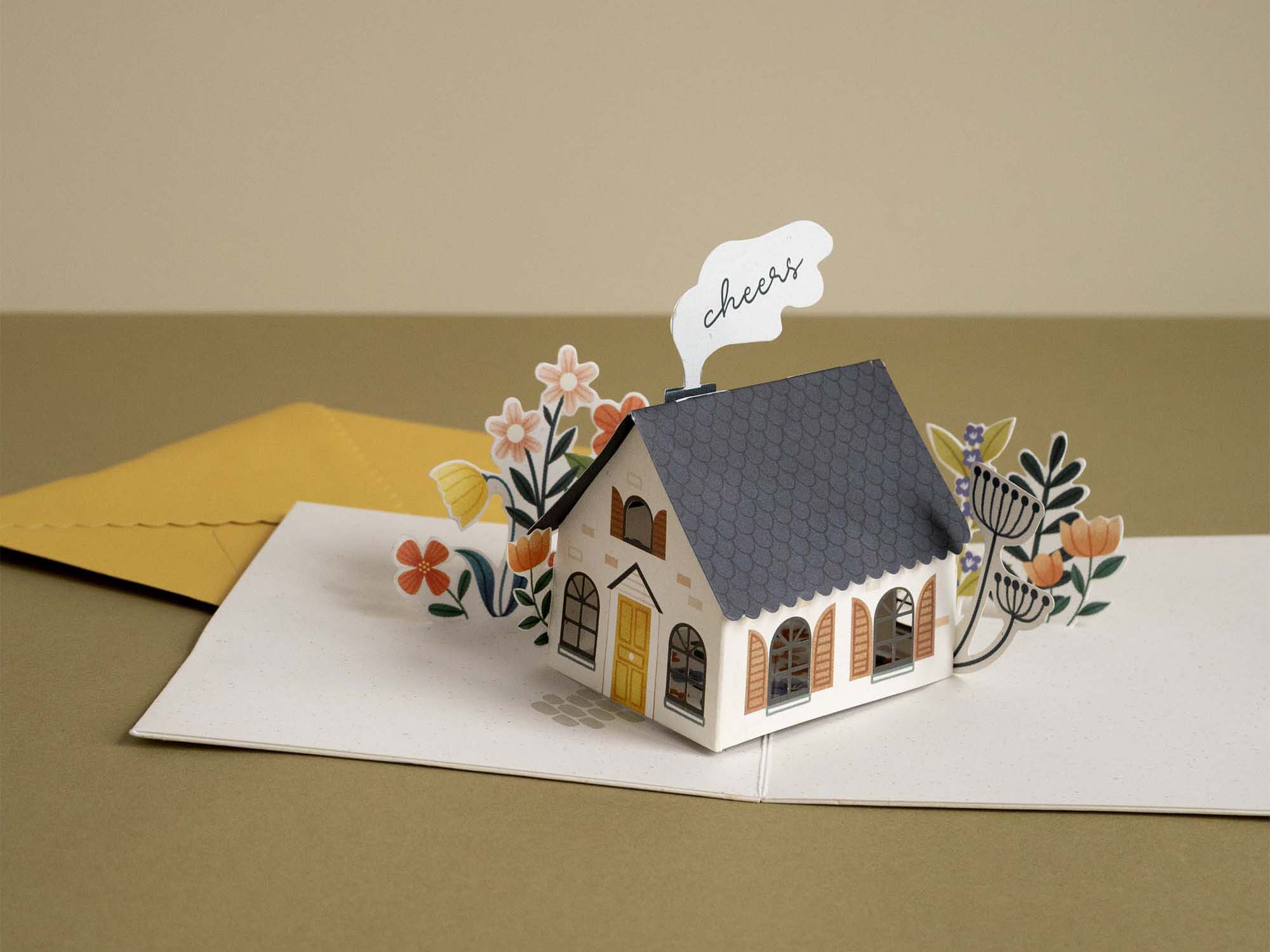 Our Pure Alchemy Collection features cheeky salutations and pop-ups mixed with intricate laser-cutting. A garden flourishes around a cozy cottage.