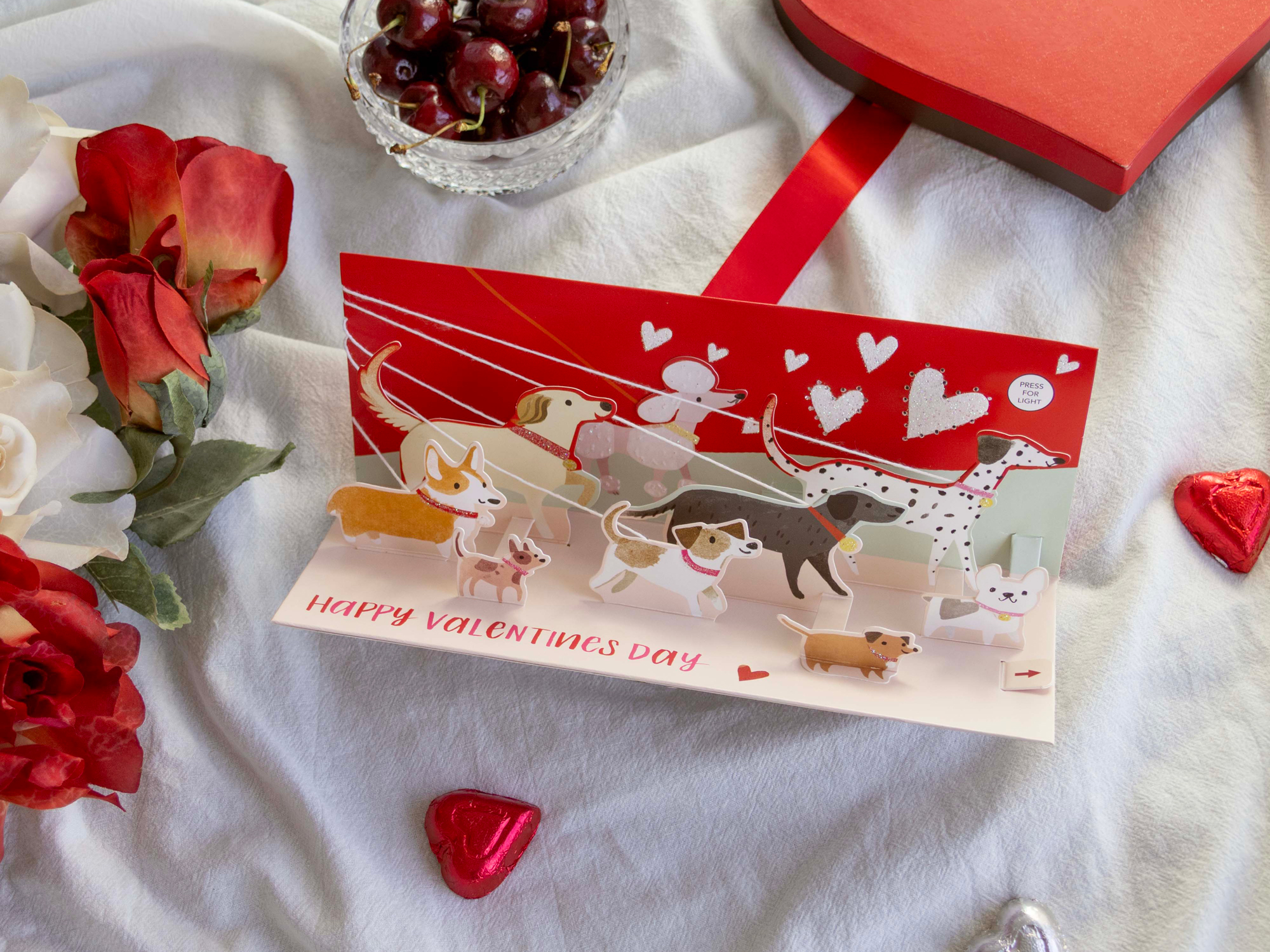 Panoramics are horizontal format cards designed to showcase a festive pop-up scene. Fiber-optic red hearts emerge as the dogs enjoy a Valentine walk.